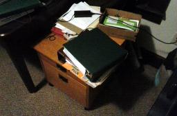 Your filing cabinet rests between your desk and bureau. It has a large bottom drawer and a small top drawer. On top of it are heaps of papers and paper-like objects: notepads, a cardboard box of mail and assorted items, and two humongous 3-ring binders.