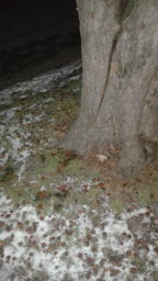 At the front lawn you sit under a tree on some snow, facing West. It's night time.